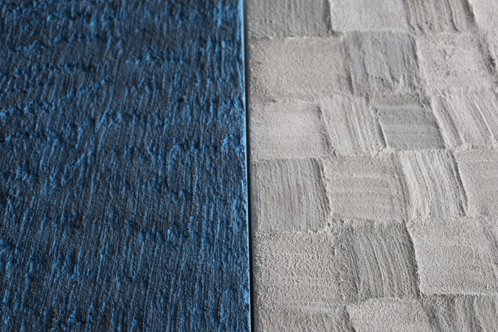 a deeply structured, dark-coloured texture with vertical grooves and a modular, light-coloured surface with a handcrafted directional relief. The exciting interplay of haptic depth and geometric order underlines the conceptual demands on materiality, light effects and tactile quality in an architectural context.
