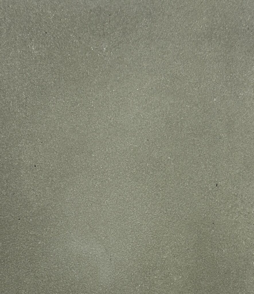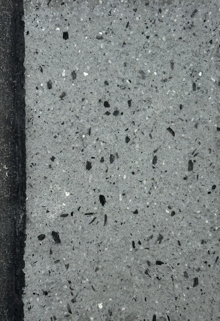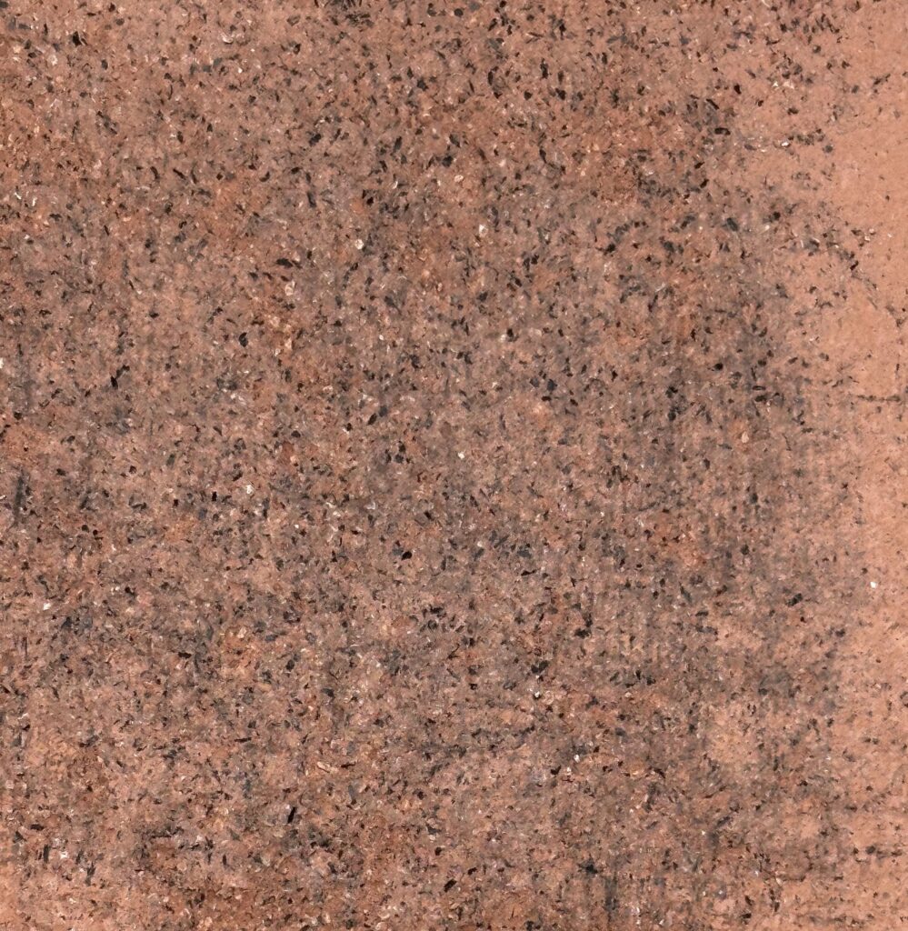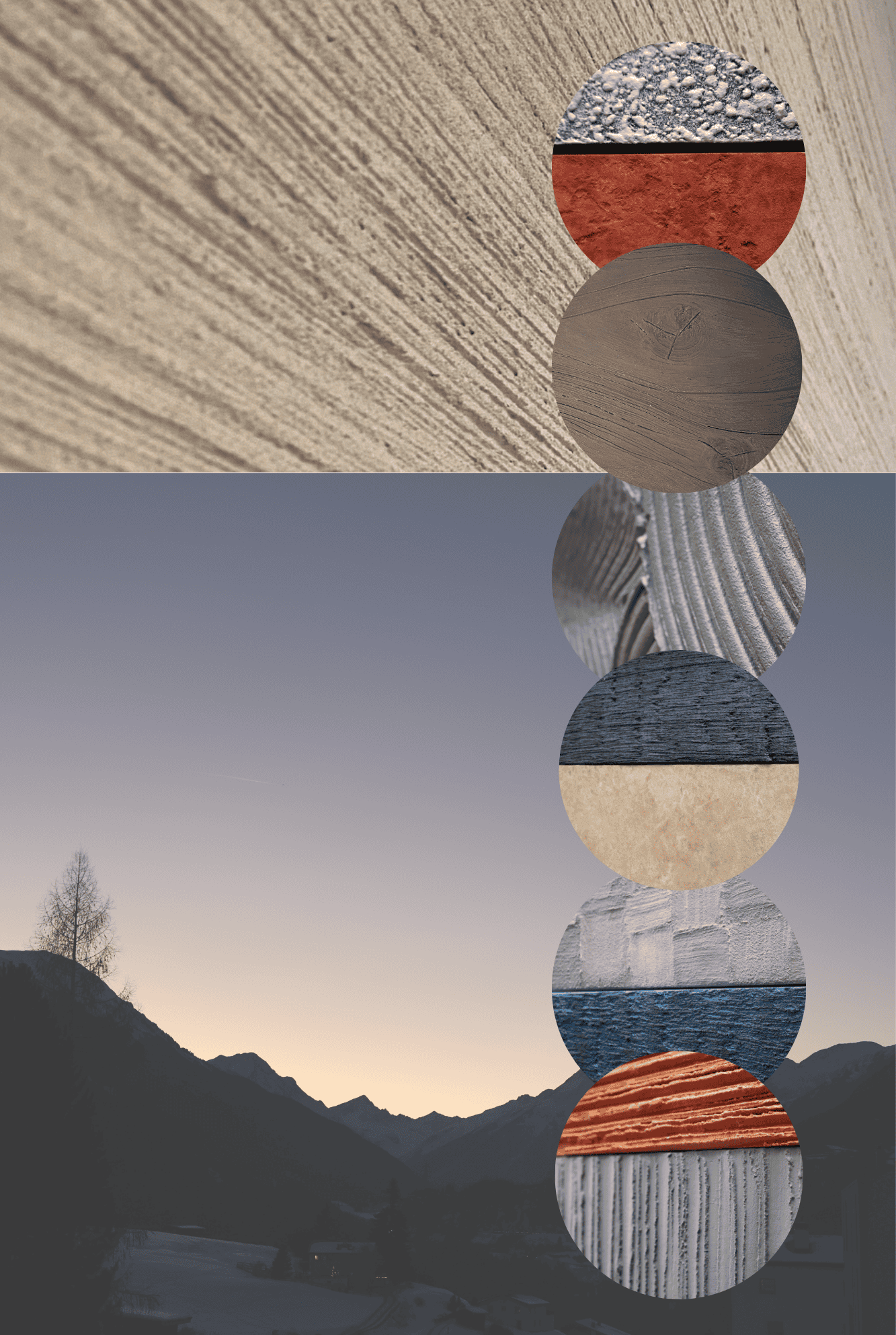 This composition thrives on the dialogue between two expressive material surfaces: on the left, a warm, earth-red surface with a velvety matt texture reminiscent of compacted clay – calm, grounded, archaic. On the right, a highly sculptural, crater-like texture in cool grey contrasts with this, evoking geological processes or volcanic solidification. The juxtaposition creates strong visual tension and symbolises the tension between natural calm and eruptive dynamism – a powerful design element for atmospherically charged architectural spaces.