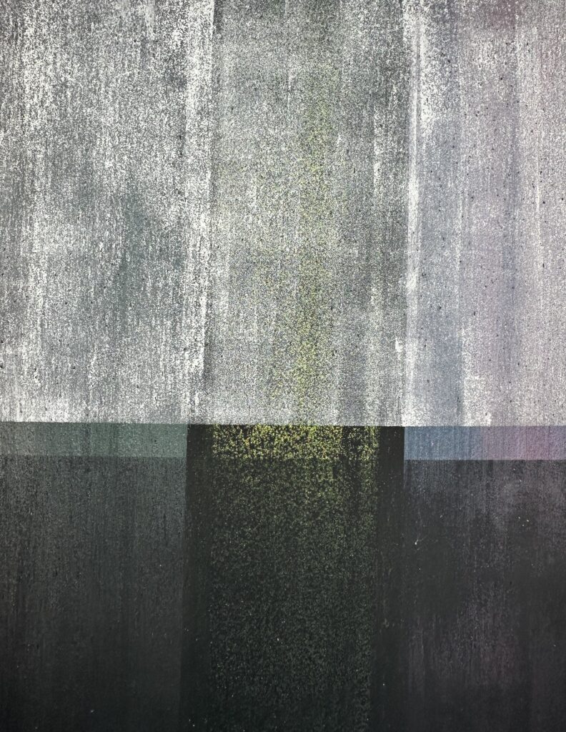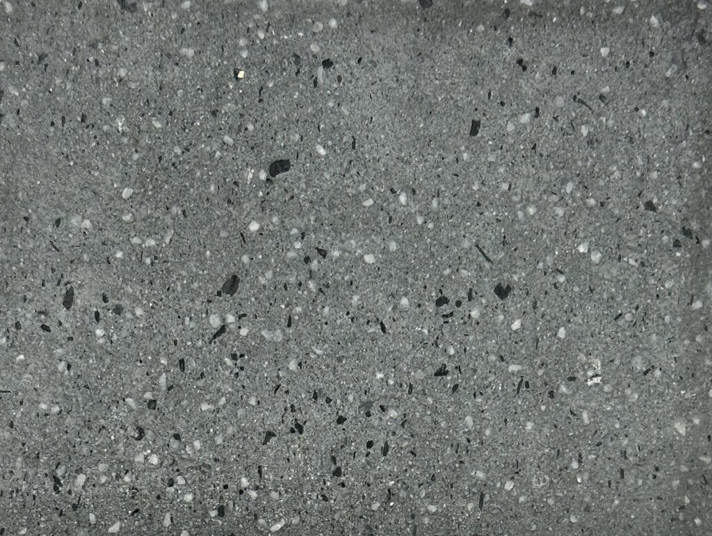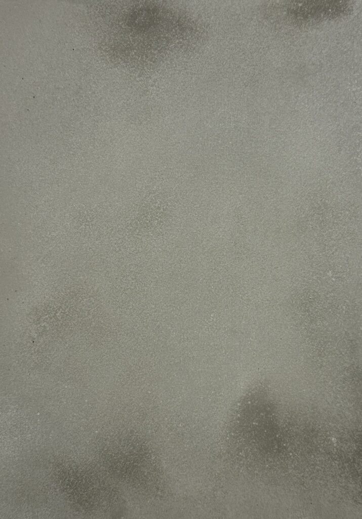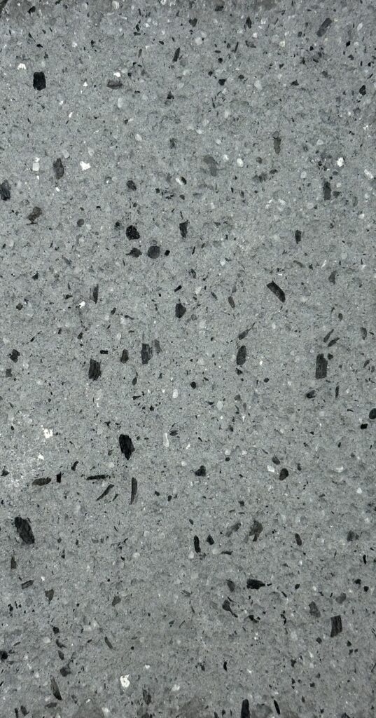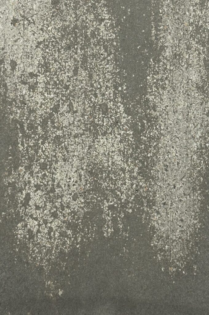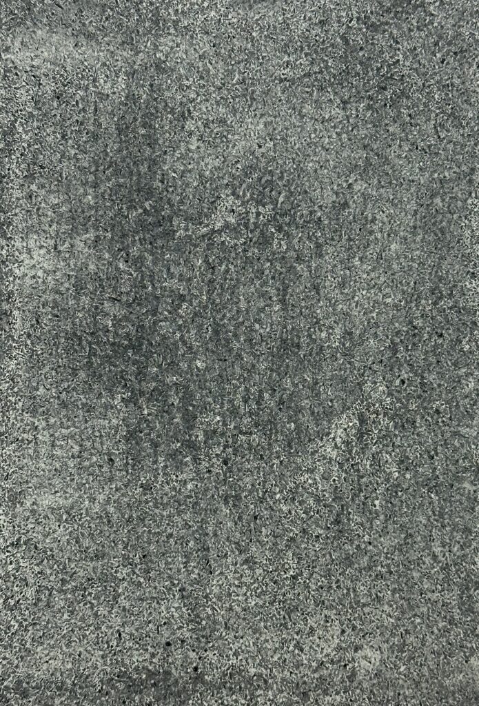 This composition thrives on the dialogue between two expressive material surfaces: on the left, a warm, earth-red surface with a velvety matt texture reminiscent of compacted clay – calm, grounded, archaic. On the right, a highly sculptural, crater-like texture in cool grey contrasts with this, evoking geological processes or volcanic solidification. The juxtaposition creates strong visual tension and symbolises the tension between natural calm and eruptive dynamism – a powerful design element for atmospherically charged architectural spaces.